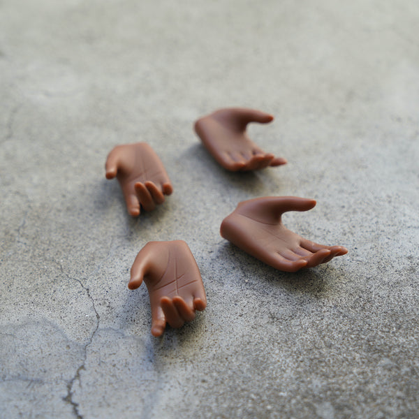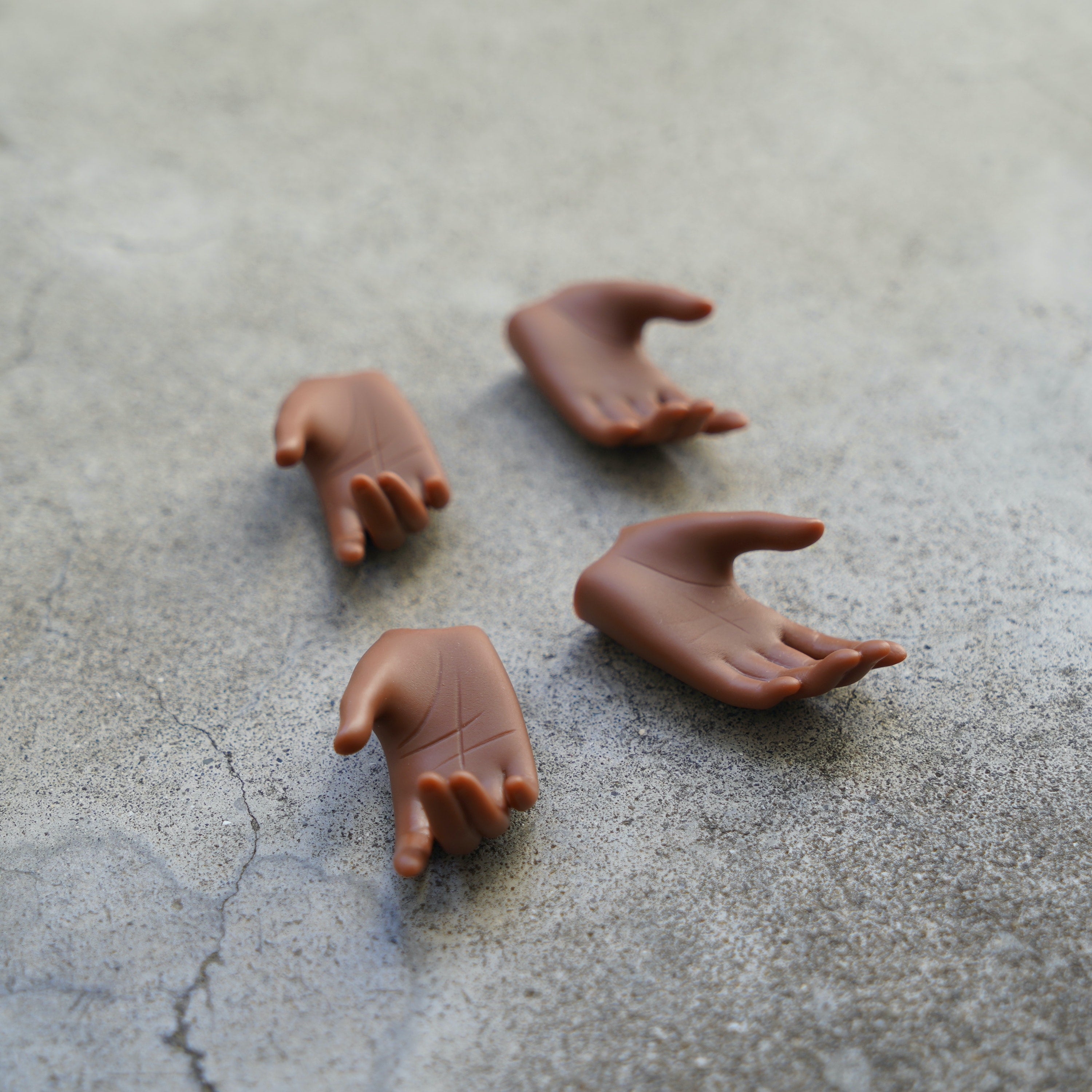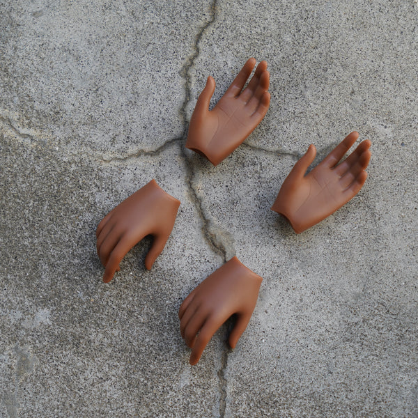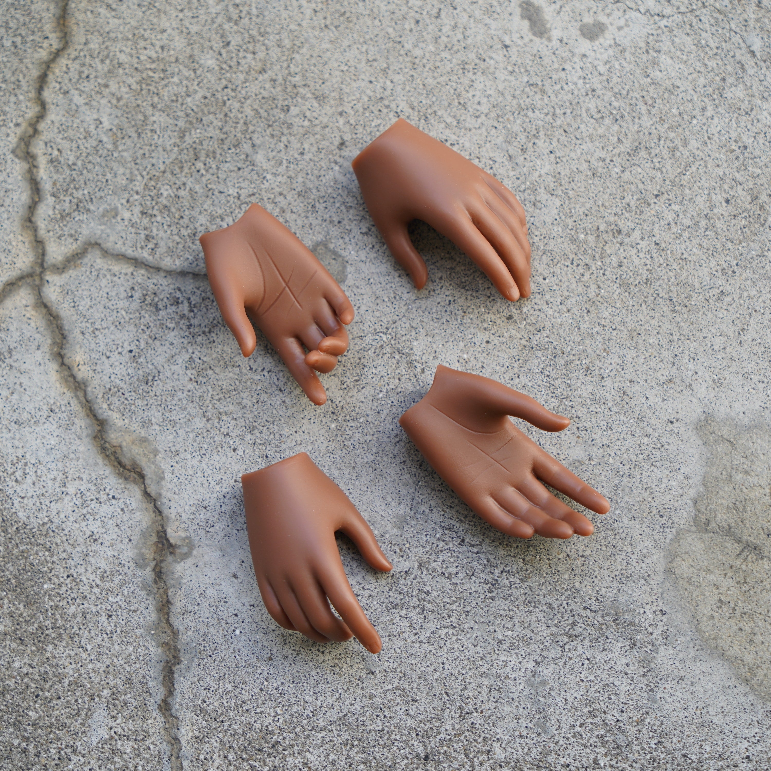 Because of the way they are packaged, the hands may arrive with small indentations caused by them squishing against each other during transit. If you notice any, they can usually be fixed by gently heating the area with a hairdryer or by soaking the hands (not YOUR hands!) in hot water (around 75°C / 167°F). Please be careful not to burn yourself — or anyone else — in the process.