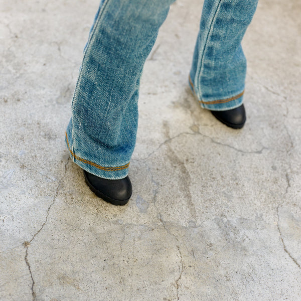 These jeans also undergo a journey to Okayama for additional processing, including laser etching for whiskers, manual ripping, stone and bio-washing, and a secondary dyeing process to achieve a brown/yellowish worn look. Finally, a color-fixing agent is applied before they return to our Tokyo studio for loose thread snipping, quality control, and packing.