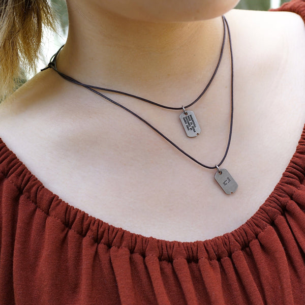 You only get one tag on a cord - if you want to wear more than one tag on the cord then you will need to buy another one but we recommend that you get one of the others instead of having two of the same. The opposite side of the tag is the CJ logo.