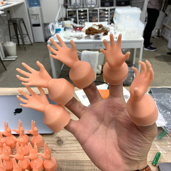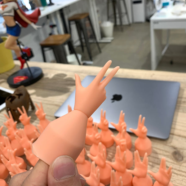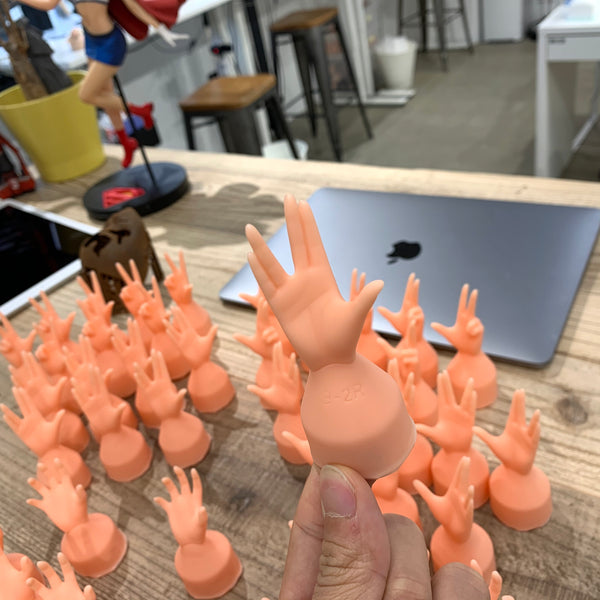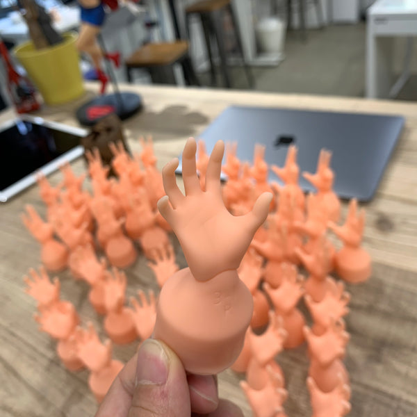 A ton of hands made in bright pink! The reason why we made them was because this is a special vinyl used for making a mass production mold. The material does not shrink as much as normal vinyl which is important for making a mass production mold.