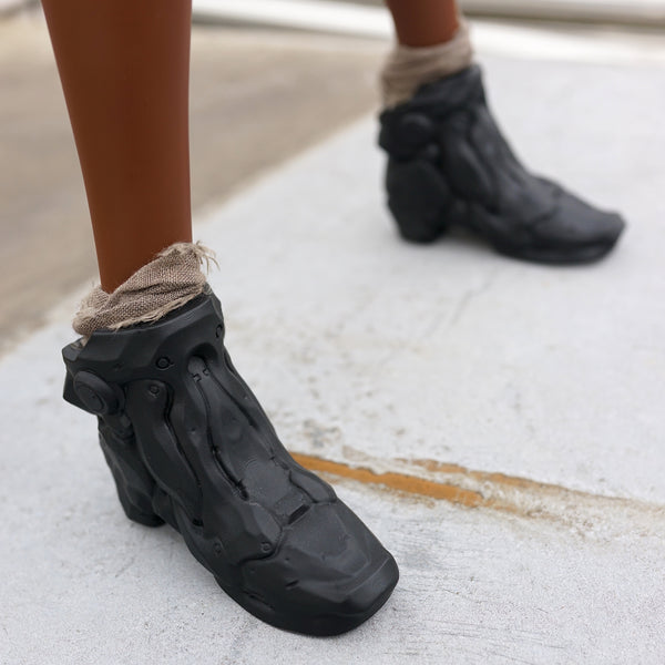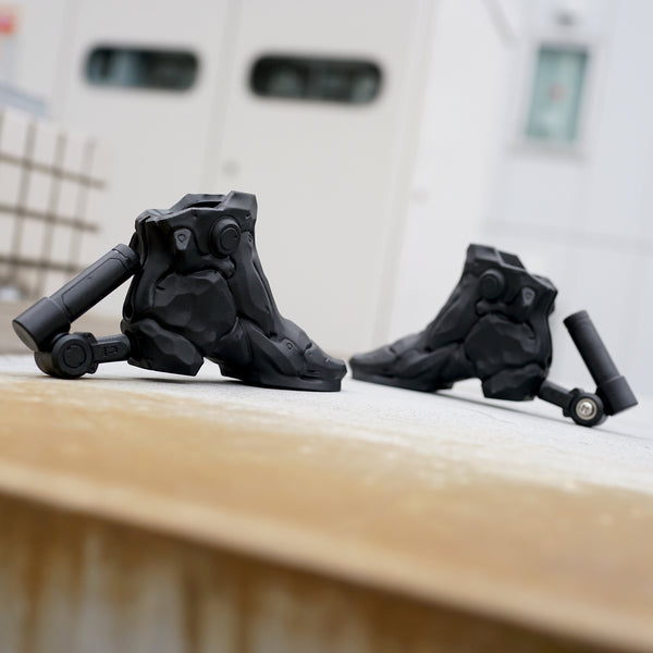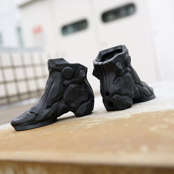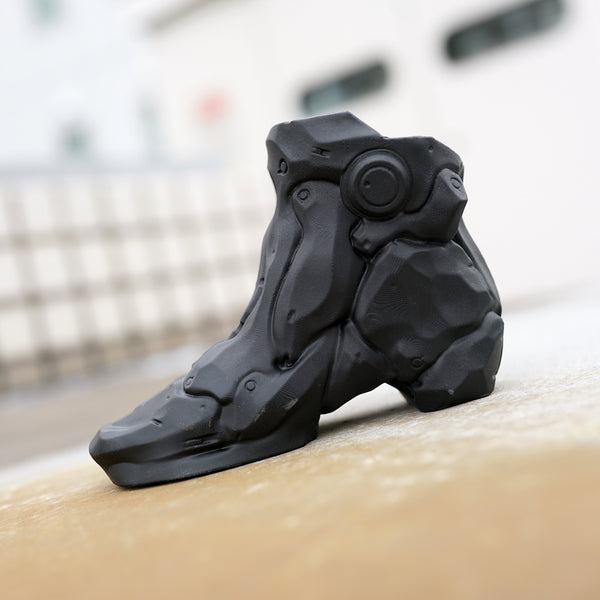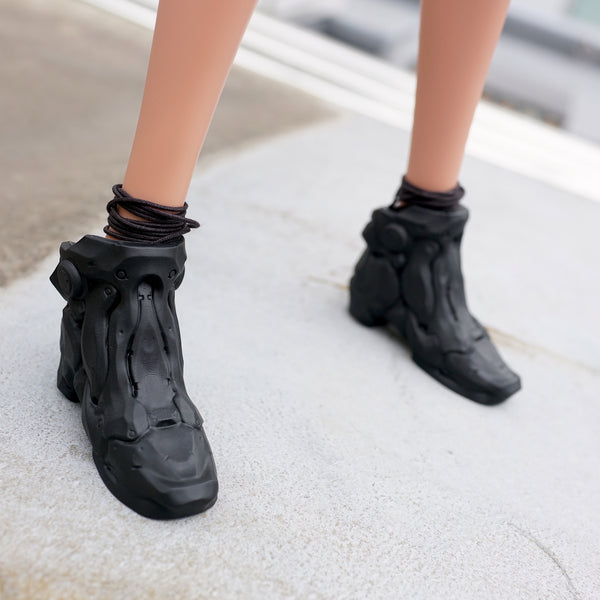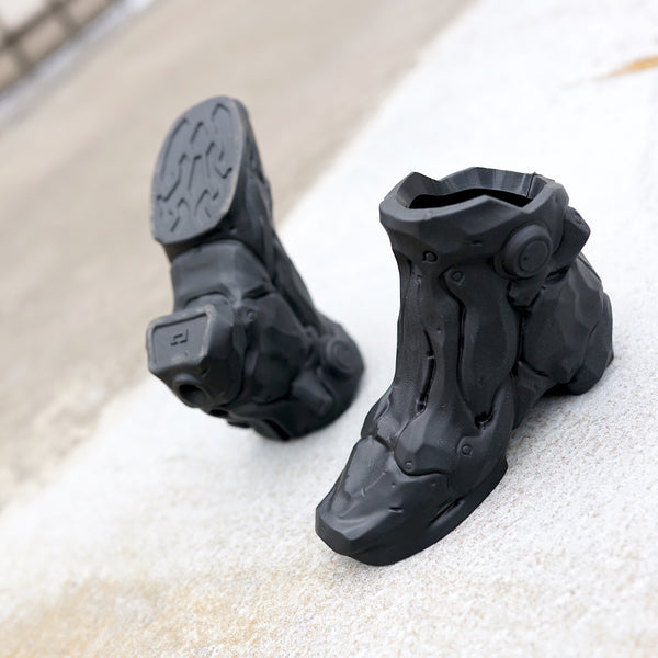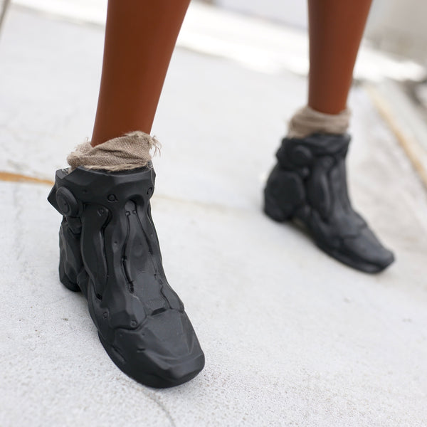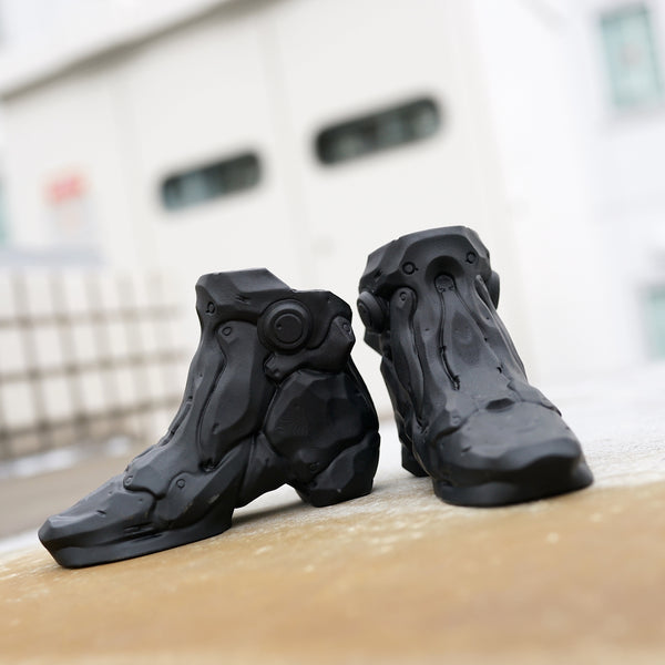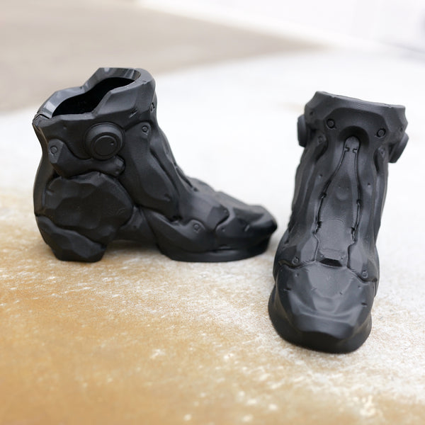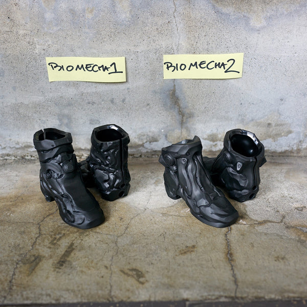 A fusion of organic and mecha design - our new line of Vinyl Bio Mecha footwear results from many (maaany) moons of experimenting with non-conventional shoe-making techniques - 3D printing and vinyl casting - you can see just some of the prototypes below.