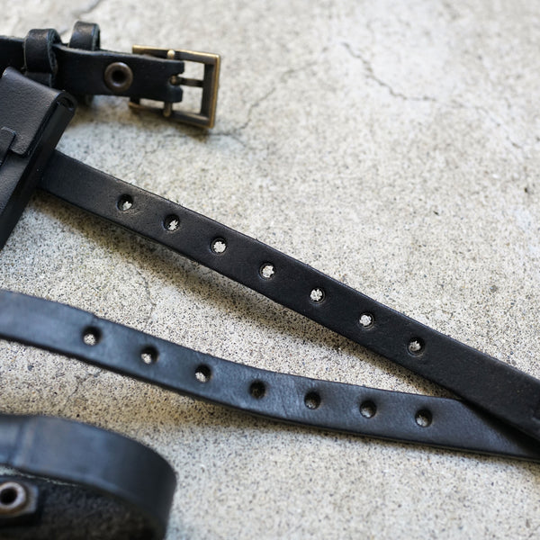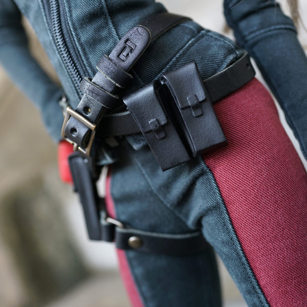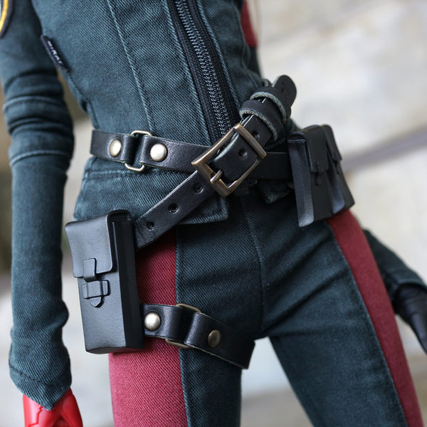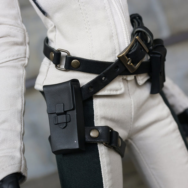 The Combat Belt consists of two belts worn in a criss-cross manner. One belt has a large pouch, while the other has two smaller pouches.