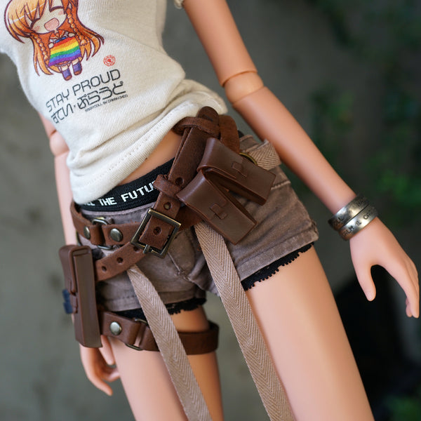 The Combat Belt consists of two belts worn in a criss-cross manner. One belt has a large pouch, while the other has two smaller pouches.
