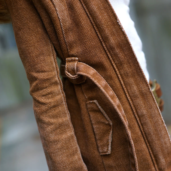 We tweaked the original design to include shoulder loops which keep our bag straps from slipping off the shoulders. The material is the same as the Military Field Jacket which has been given a warm earthly used look.