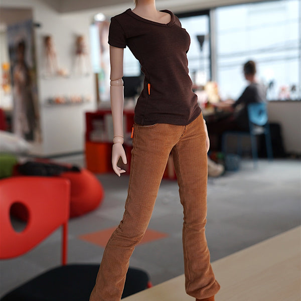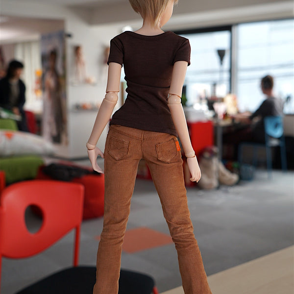 They look like suede but are not and wear out nicely when you bump them hard against surfaces. If you want them to have the worn look quicker, get a stone or hard brush to rub over the surface. The corduroy pantsu can be tucked into the boots but the default jeans cant.