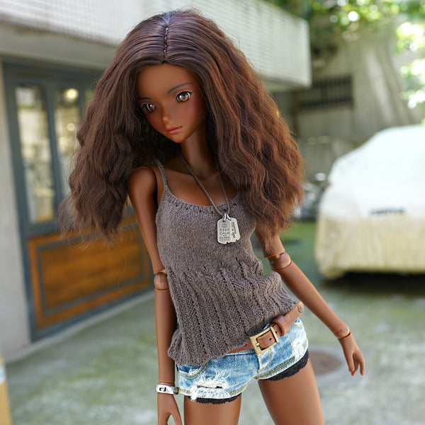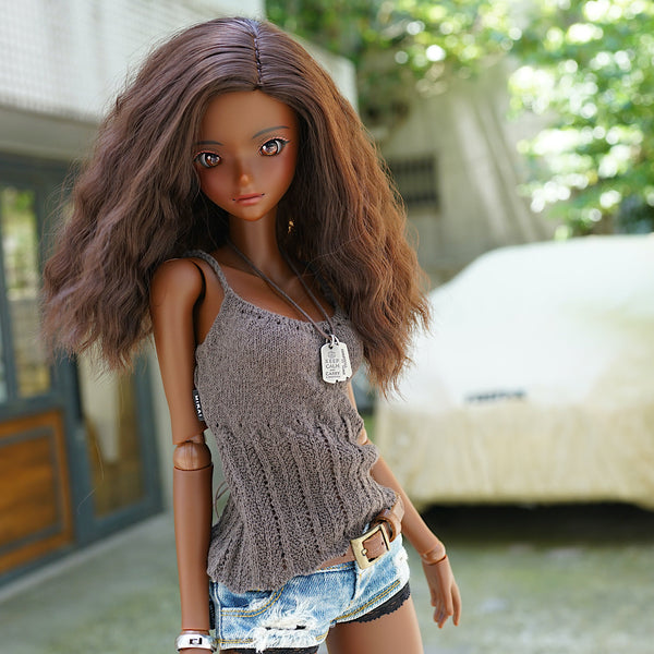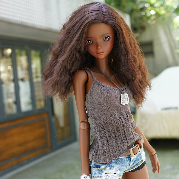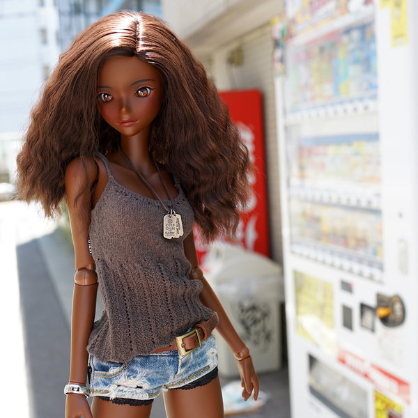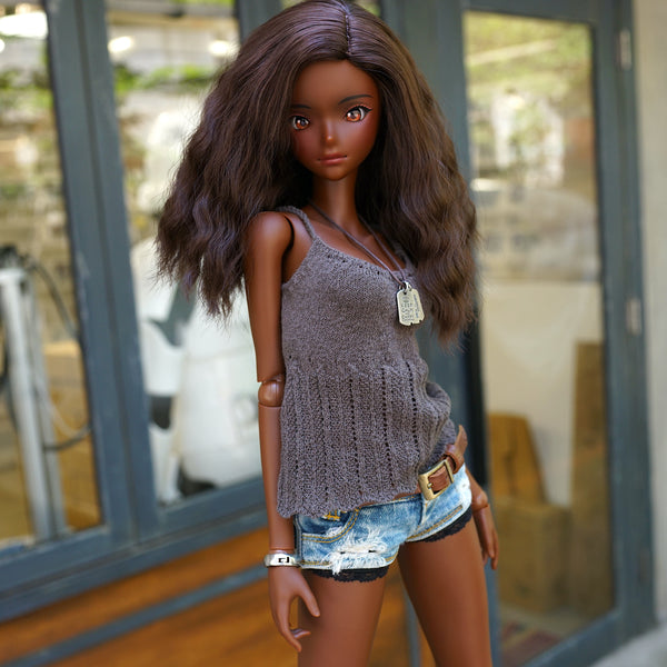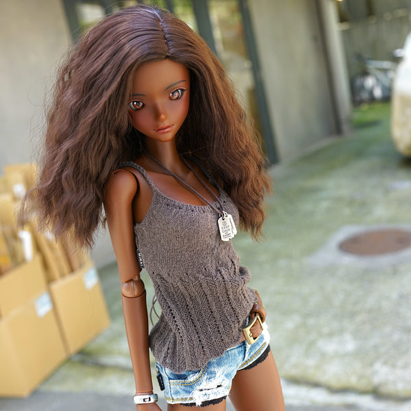 Specs are 12 gauge x 1 ply and the yarn is made from 100% cotton of a type called “Curious.” The knit is done in a way so that the surface area that touches the skin is reduced which enables the Smart Doll wearing it to feel a cool breeze - great for those warm sunny days ;-) Made in Toyama Japan.