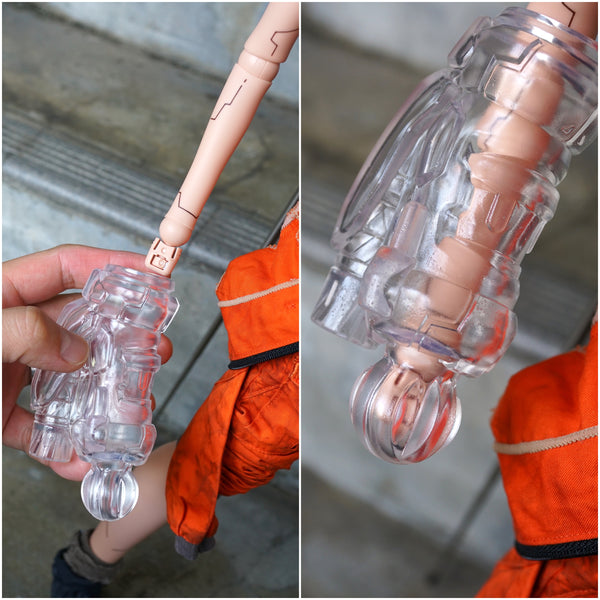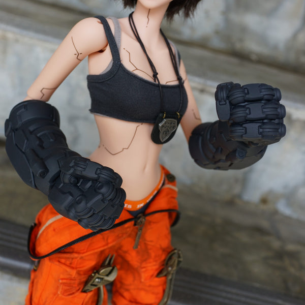 To wear the Mecha Gauntlets, simply remove the doll’s hand, slide the Gauntlet Body onto the arm, ensuring it grips securely onto the hand peg. To remove it, gently pull off the gauntlet to prevent the hand peg from staying inside; if it does remain, use long nose pliers (not included) to retrieve it.