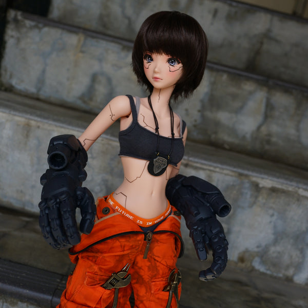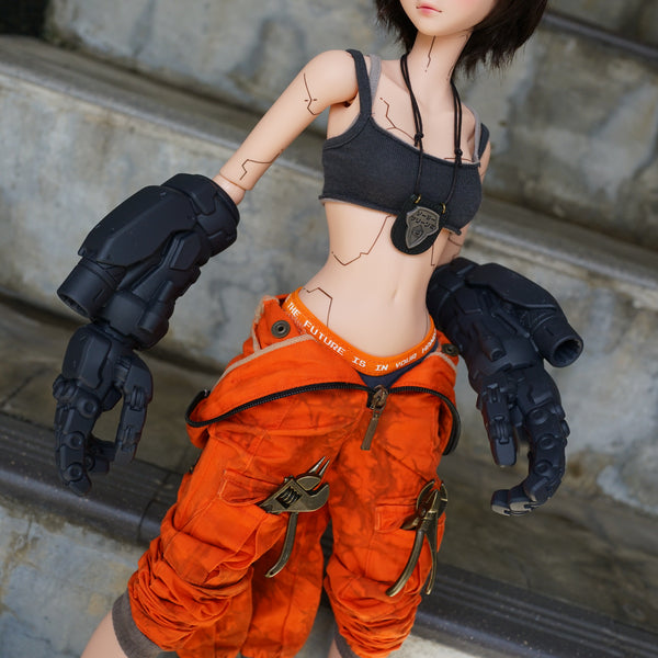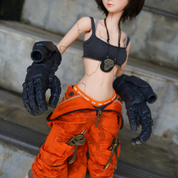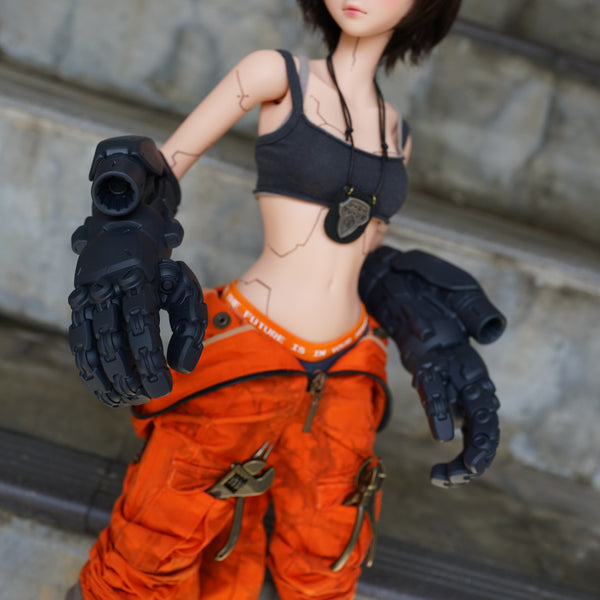 To wear the Mecha Gauntlets, simply remove the doll’s hand, slide the Gauntlet Body onto the arm, ensuring it grips securely onto the hand peg. To remove it, gently pull off the gauntlet to prevent the hand peg from staying inside; if it does remain, use long nose pliers (not included) to retrieve it.