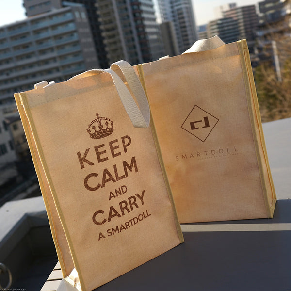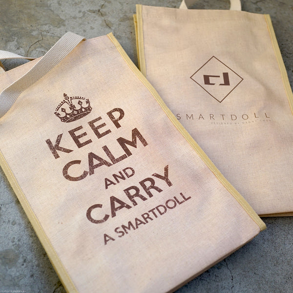 The outside of the bag is covered in a film with the "Keep Calm" logo on one side and the Smart Doll logo on the other. The film not only acts as a water proof layer, but also keeps the bag upright so that you can take the traditional Smart Doll Welcome pose.