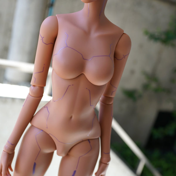 We're contemplating the release of a simplified version with fewer panel lines, particularly on the back and in areas typically covered by pants and a camisole. This alternative would allow us to increase production while maintaining a cybernetic aesthetic for those who plan to dress their dolls in at least the bare essentials.