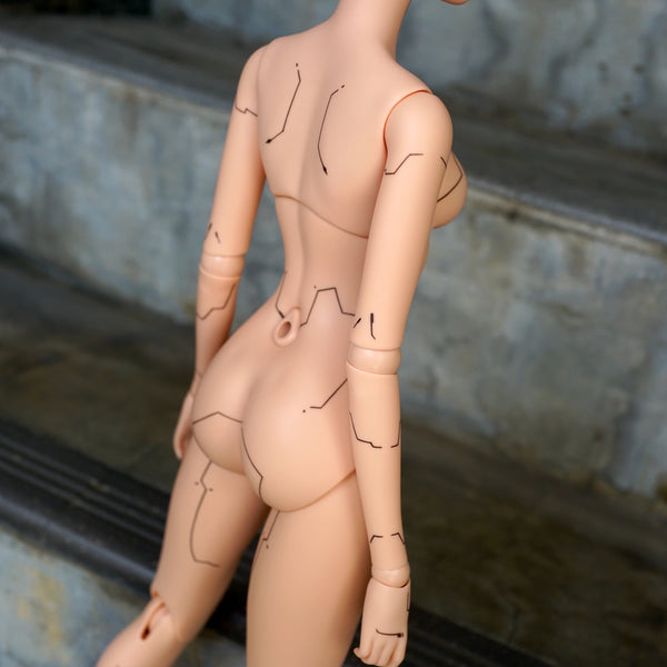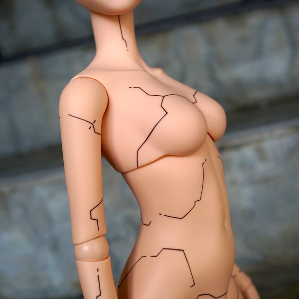 We're contemplating the release of a simplified version with fewer panel lines, particularly on the back and in areas typically covered by pants and a camisole. This alternative would allow us to increase production while maintaining a cybernetic aesthetic for those who plan to dress their dolls in at least the bare essentials.