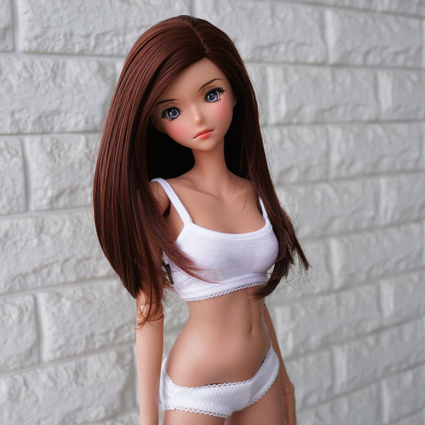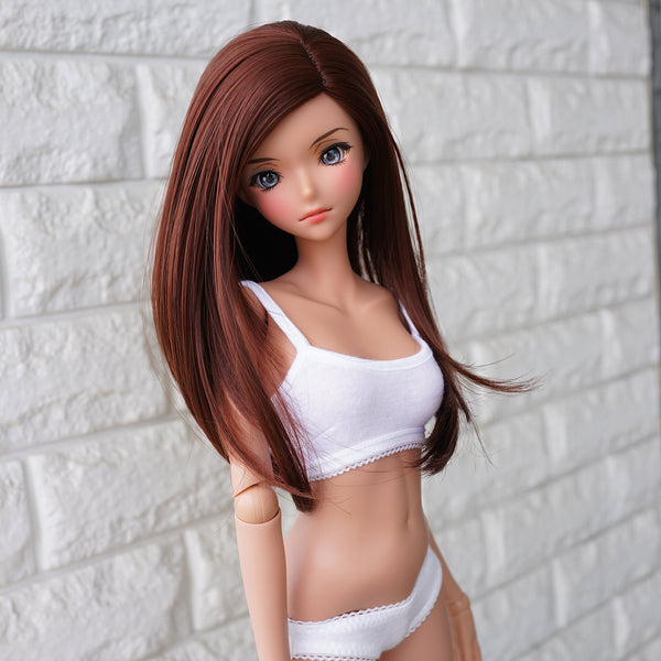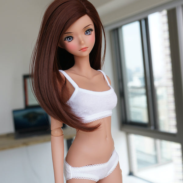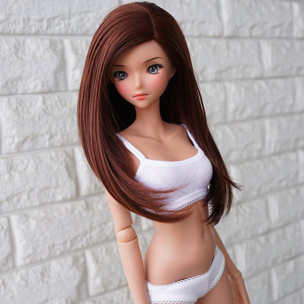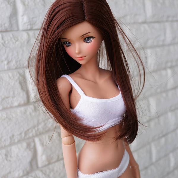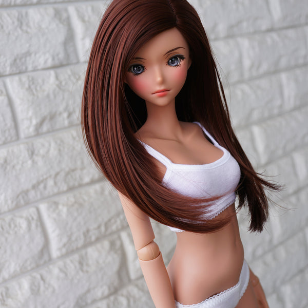 Smart Doll wigs are shaped by hand—not by mold—so variation is natural. You may notice differences in thickness, alignment, or shape from one wig to the next. Some may appear “balding” in spots or shed small amounts of hair when first opened and with continued use. Tight fits can leave marks on the head, and a bit of styling oil residue is also expected. (images 1 - 4)