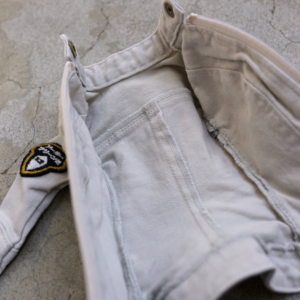 - The weathering process causes paint chips on the zips and random patterns on the snap buttons.