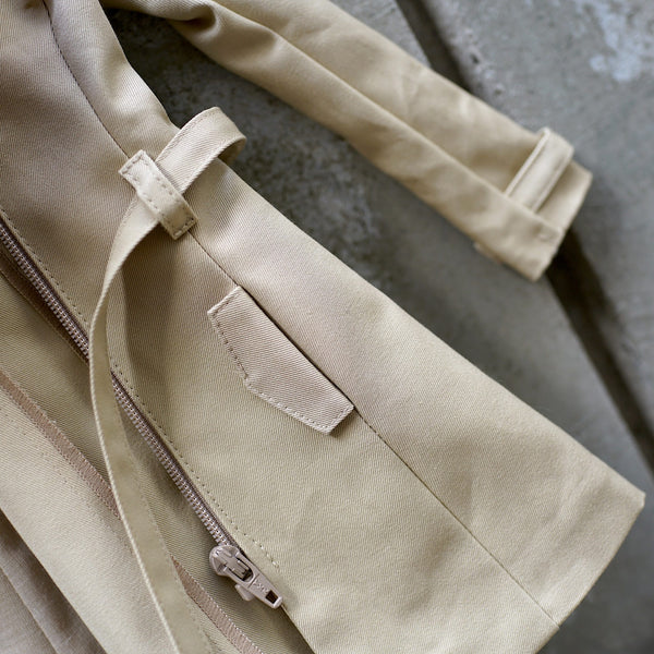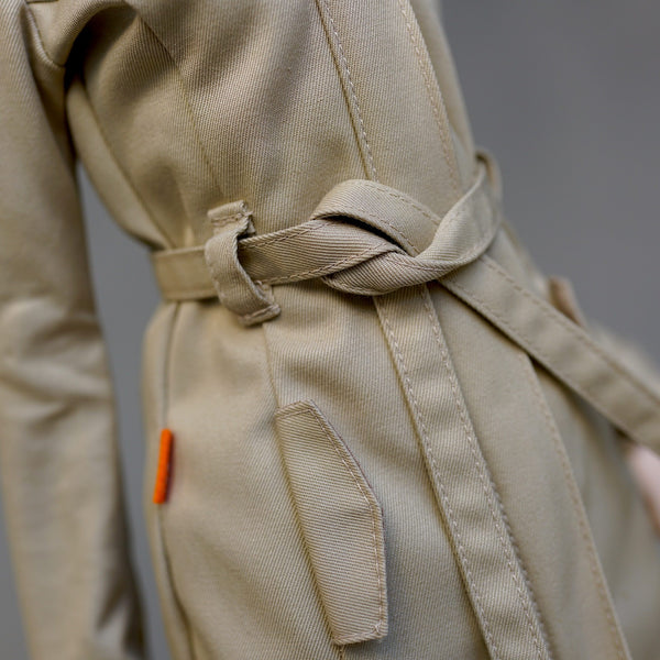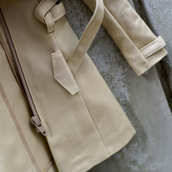 やっとリリースできたスタンドカラートレンチコートのベージュバージョンはジュン アシダのアパレルを手がける辻洋装店が東京で量産を担当し、カーキグリーンバージョンはAKB48のステージ衣装を手がけるフューチャーブランドが東京で量産を担当。