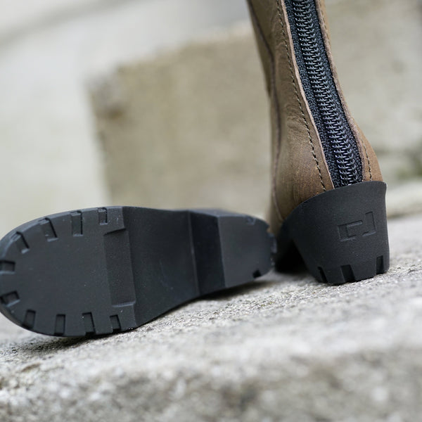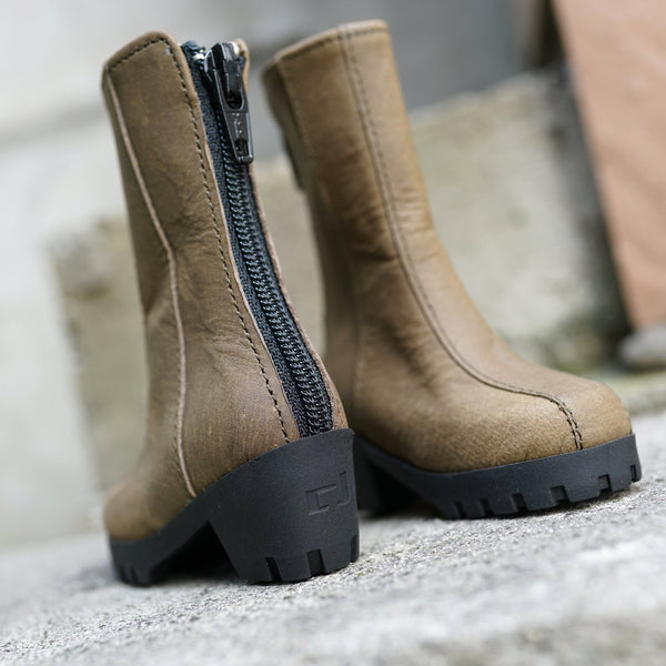 The boot is made from leather where the surface has been treated to give it a worn used look with a few scratches here and there. Goes well with long jeans but especially well with our collection of short jeans.