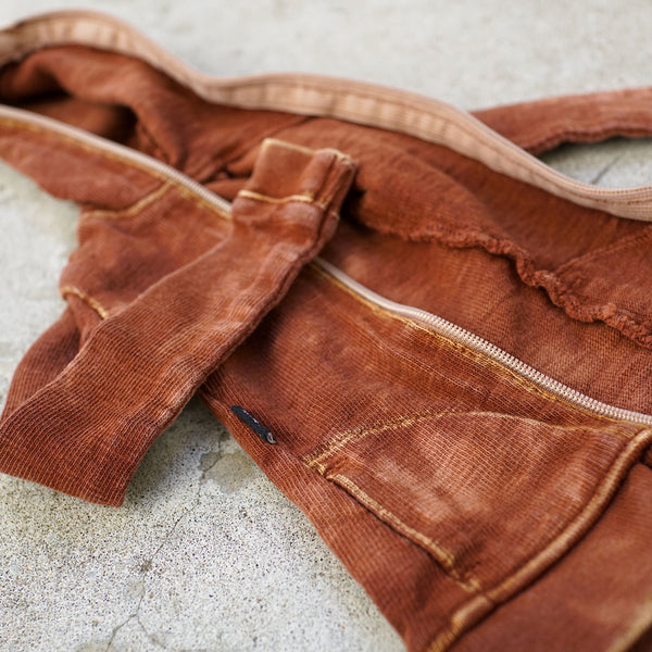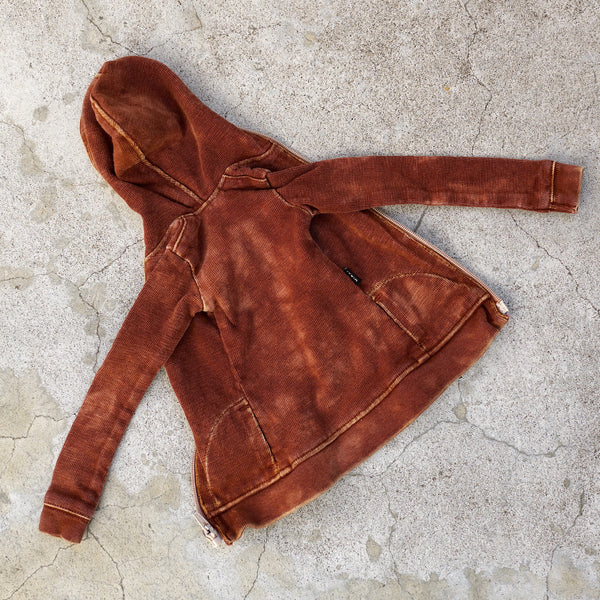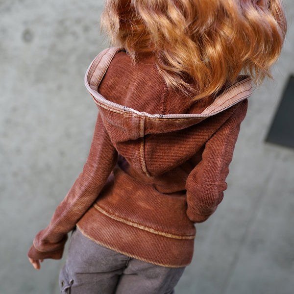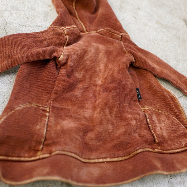 After much experimenting, we were able to get the look that I wanted, so in March 2019, we released the Weathered Hooded Zip Cardigan in Rusty Brown.