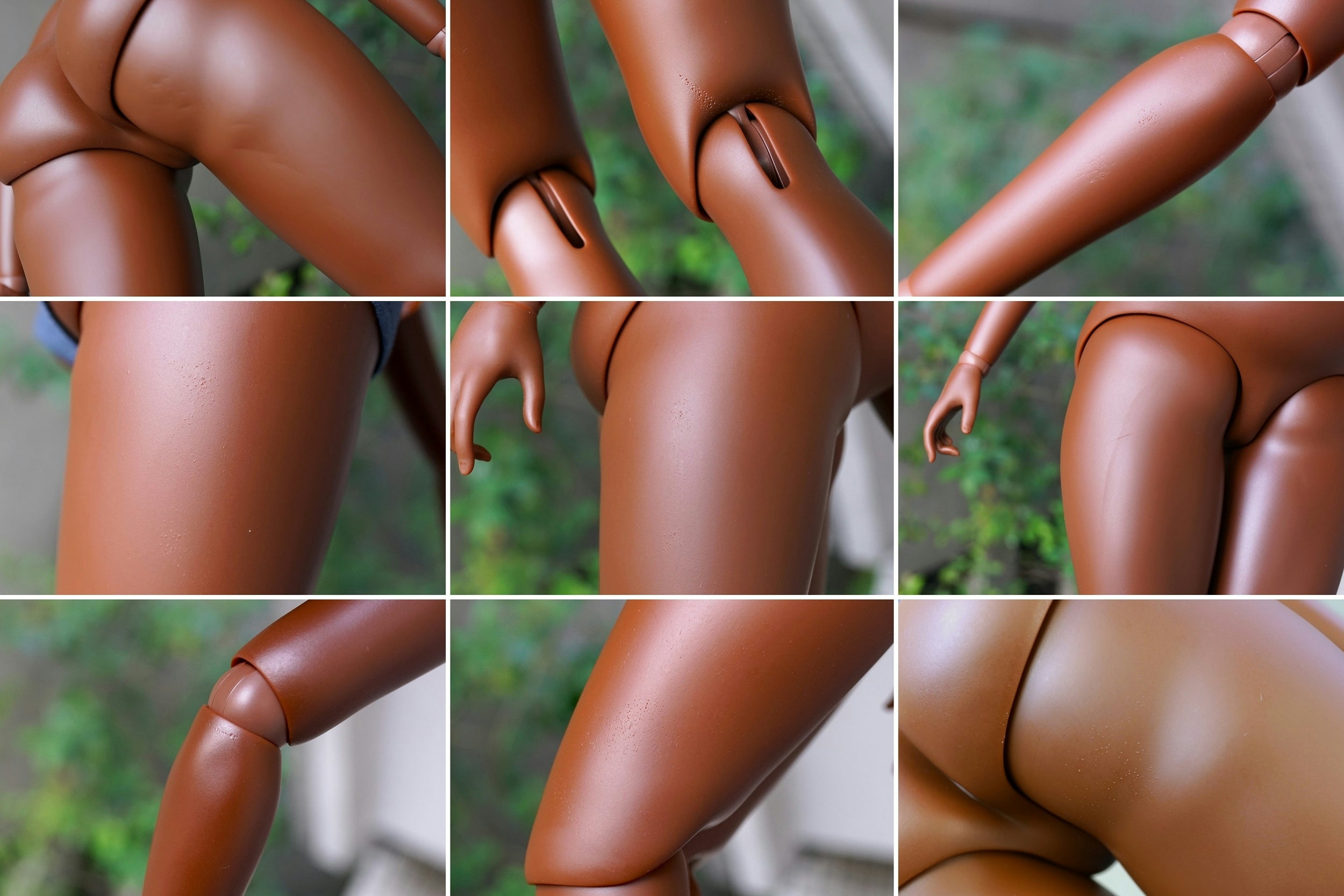When standing with thighs rotated back, the tops of the thighs may protrude slightly (image 6). This also occurs in the Classic Body but is more noticeable with the Pear due to size. Additionally, the larger hollow thighs increase both tactile and audible feedback, which may be a consideration if you prefer a quieter posing experience.